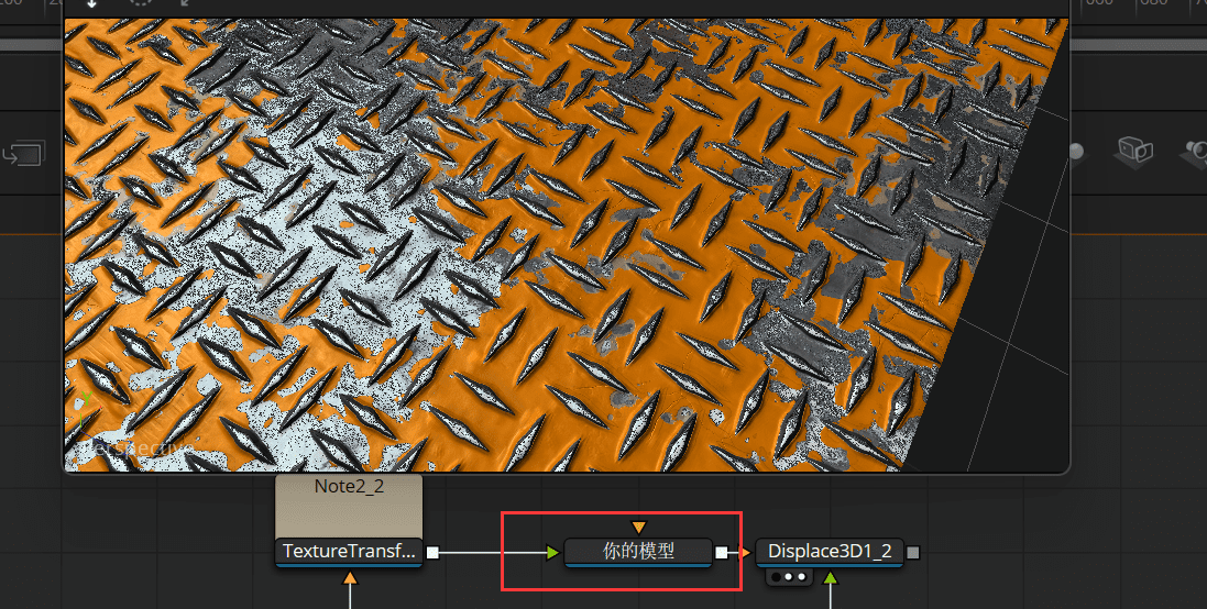 - 第三个节点为模型置换,像瓦片、金属球这些材质置换后会有更多的细节但相对的也更耗费性能,置换是请使用足够的细分如果是自带的模型建议设置细分为512。